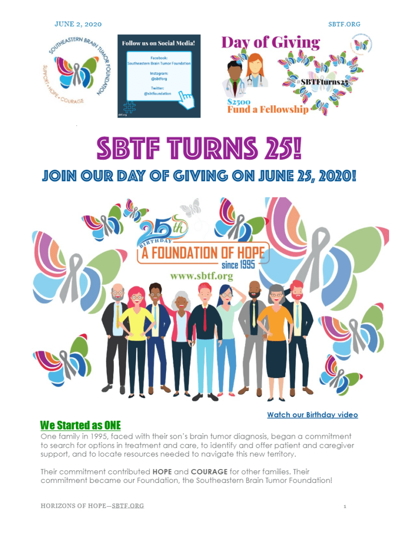 The summer quarterly newsletter published by the Southeastern Brain Tumor Foundation highlights the Foundation’s 25th birthday celebration.