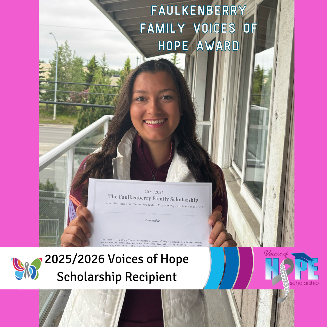 "I’m pleased to share that I was awarded the Faulkenberry Family Voices of Hope Academic Scholarship! The Southeastern Brain Tumor Foundation’s Voices of Hope Scholarships are awarded to individuals who have been impacted by a brain tumor diagnosis. This scholarship will give me the opportunity to continue my education at the University of Michigan this fall.