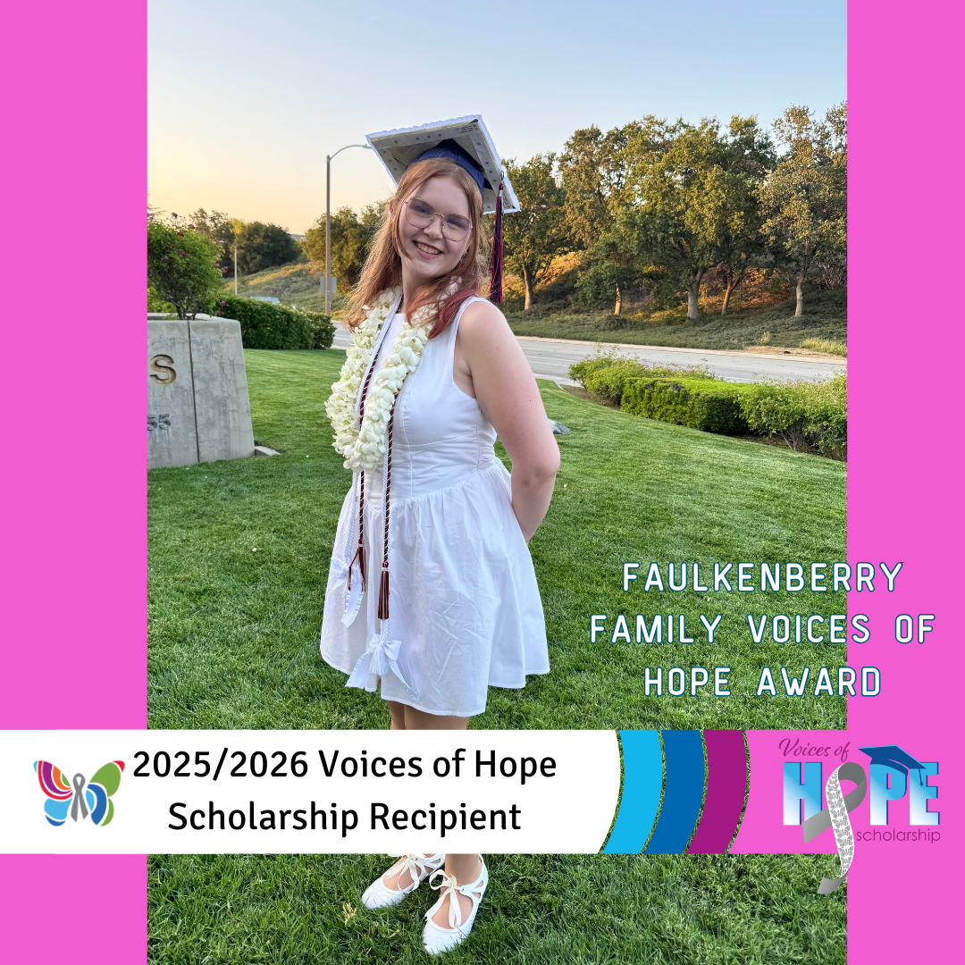 "I am honored to be a recipient of the Karen Herman Voices of Hope Academic Scholarship as I begin a new chapter of my life. With the help of this generous scholarship, I plan to study neuroscience at Scripps College and spread hope for other survivors like myself. Thank you to SBTF for helping me take one step toward my future academic endeavors that I hope can one day aid survivors and families affected by brain cancer."