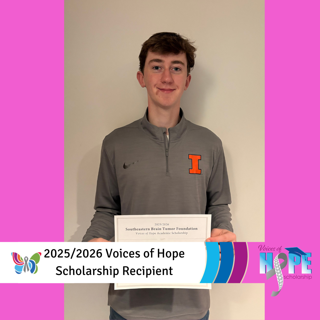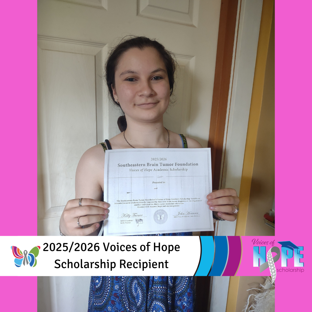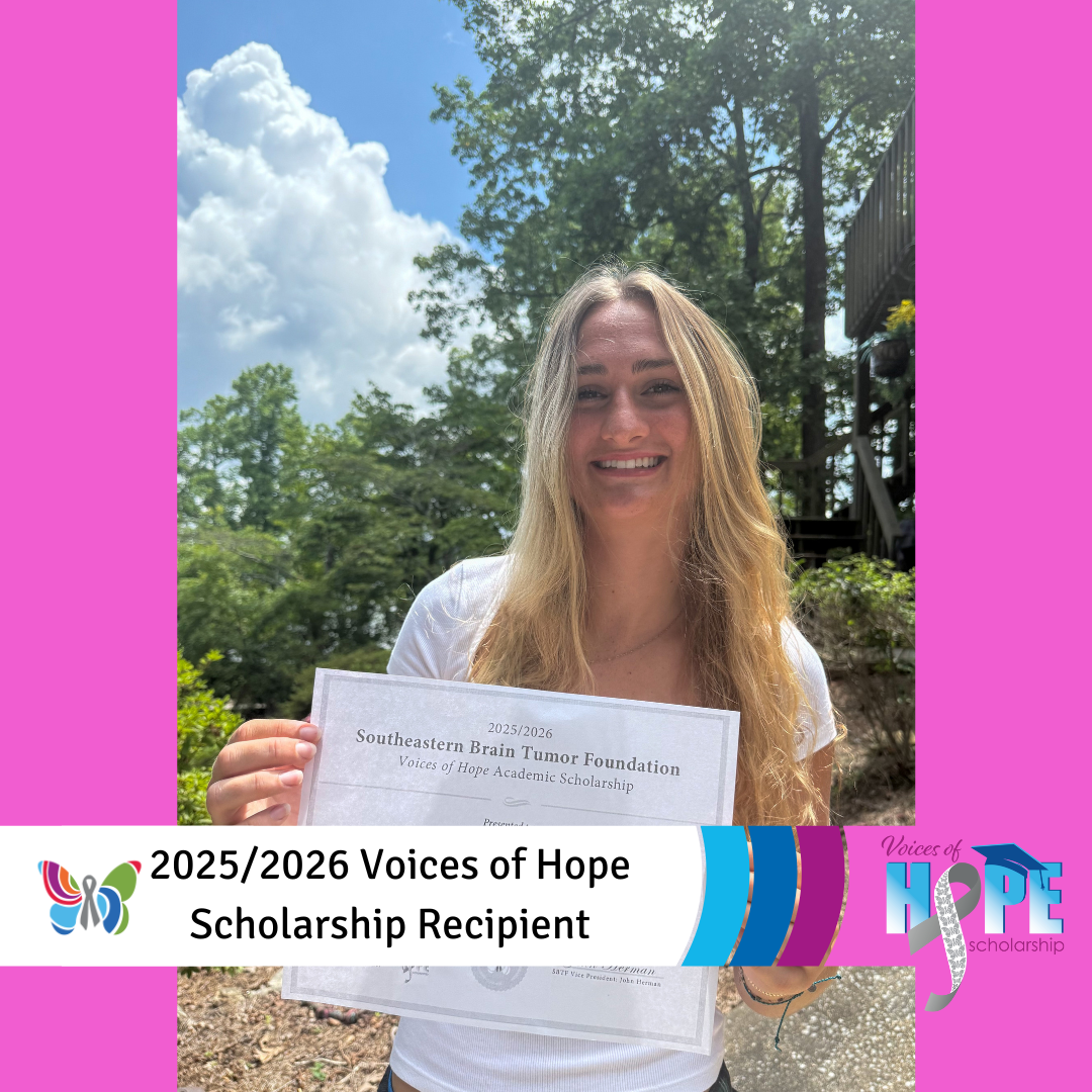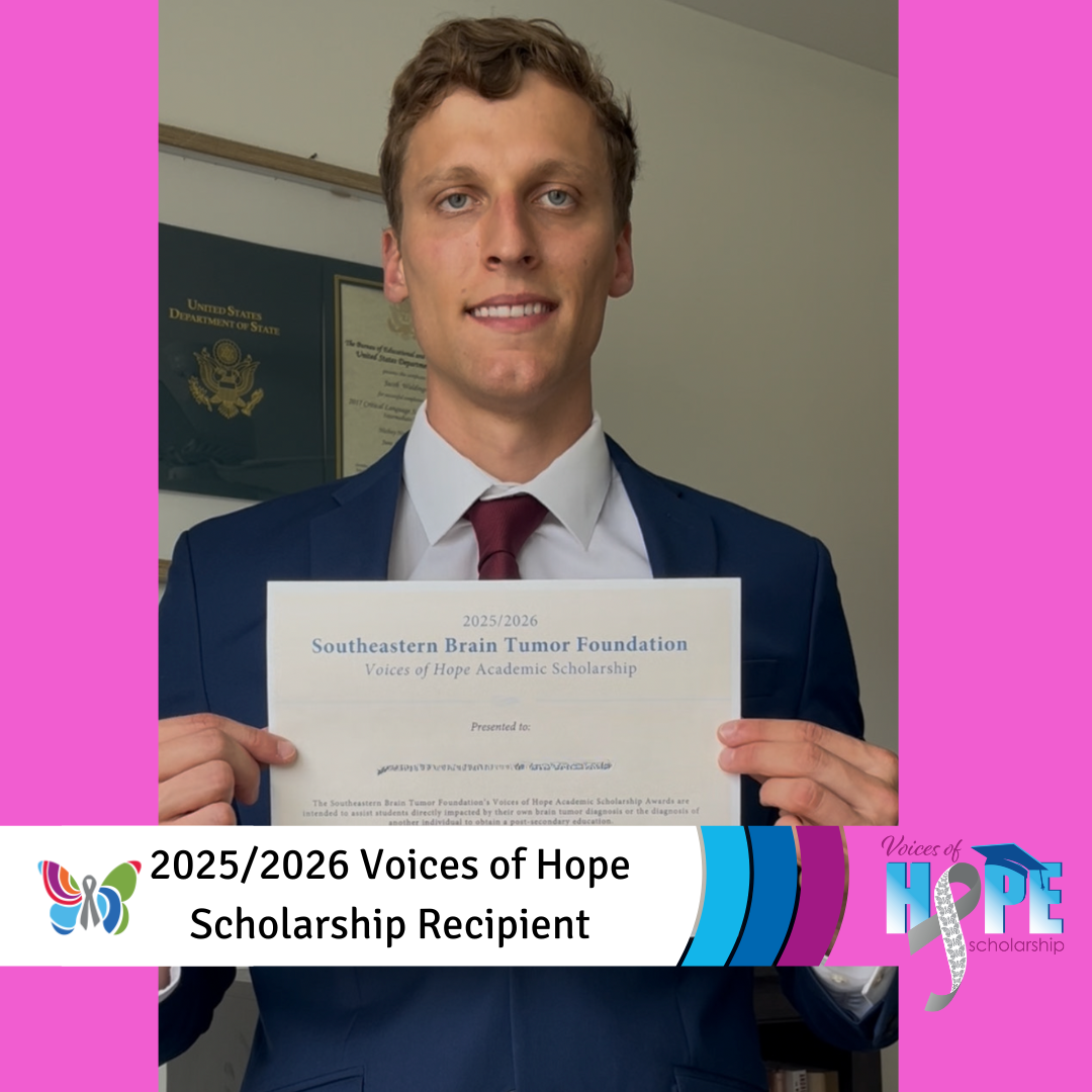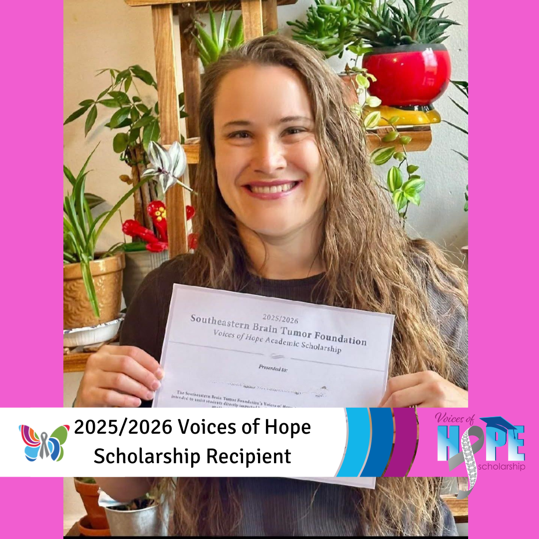 The Southeastern Brain Tumor Foundation’s Voices of Hope (VOH) Scholarship is made possible by the support of donors and constituents. It is the hope of the foundation for the scholarship to provide an opportunity to those stricken by a brain tumor and brain cancer, whether as a patient, caregiver, or family member, to fulfill a dream of receiving a higher education.